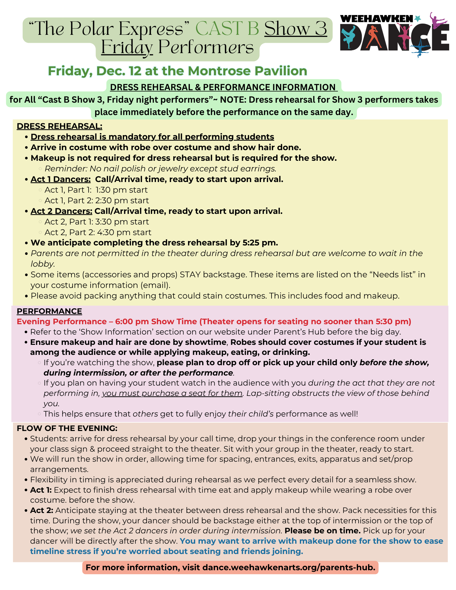 Performers in Show 3 (Friday Evening): Attend the Friday, December 12, 2025 Dress Rehearsal, which takes place directly before the evening Performance.